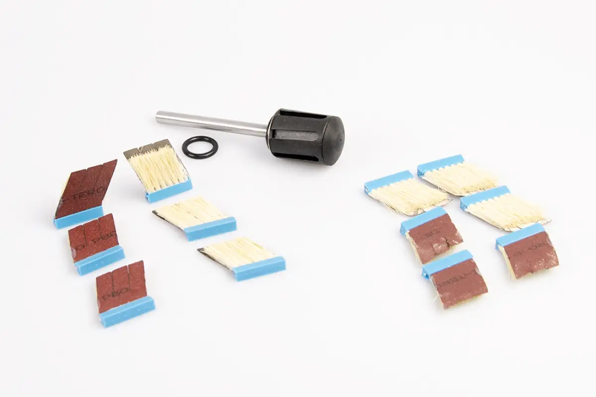 Радиальная втулка системы De-Tero Rmini имеет размер 30х32х8 мм и состоит из 6 сегментов для установки абразивных щеток. Абразивные материалы системы имеют различную зернистость (от Р60 до Р320) и представлены в размерах 30х30/35х10 мм. Шлифовальные щетки могут быть как прямыми, так и с наклоном вправо. Прямые щетки имеют маркировку 141, а щетки с наклоном вправо обозначаются 121R. Прочный хвостовик системы De-Tero Rmini имеет длину 80 мм и диаметр 8 мм, что обеспечивает надежность и долговечность шлифовального процесса, а также помогает эффективно работать в глубоко расположенных и труднодоступных местах.