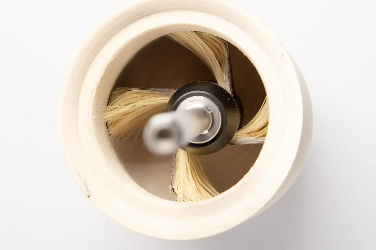 Конструкция шлифовальной системы De-Tero Rmicro тщательно продумана с инженерной точки зрения. Диаметр тела втулки, выполненного из прочного полиацеталя, составляет 23 мм. Этот материал отличается высокой стойкостью к механическим нагрузкам и износу. Заглушка из стали имеет диаметр 25 мм и выступает на 2 мм по отношению к втулке, обеспечивая дополнительную защиту и надежную фиксацию щёток. Все элементы системы изготавливаются с высокой точностью, что исключает люфты и биения в процессе работы. Благодаря этому достигается высокая точность обработки, равномерное снятие материала и качественное финишное шлифование. Кроме того, конструкция обеспечивает устойчивую работу даже при длительном использовании и высоких нагрузках. Это особенно важно при выполнении объёмных производственных задач, где стабильность и надёжность инструмента играют ключевую роль.
